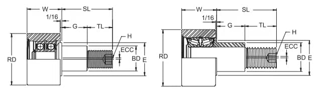 | BRG. NO. | ROLLER DIA.(RD) | WIDTH (W) | MIN. THREAD LENGTH(TL) | FINE THREADS | STUD LENGTH(SL) | ECCENTRIC DIA. (BD) +.001 -.001 | ECCENTRIC LENGTH (G) +.000 -.010 | ECCENTRIC (ECC) | HEX SOCKET(H) | SHOULDER DIAMETER(E) | RADIAL BASIC DYNAMIC RATING (LBS) | DYNAMIC THRUST LOAD RATING (LBS) | MAX. STATIC CAPACITY(LBS) | |||||||||||||||||||||||||||||||||||||||||||||